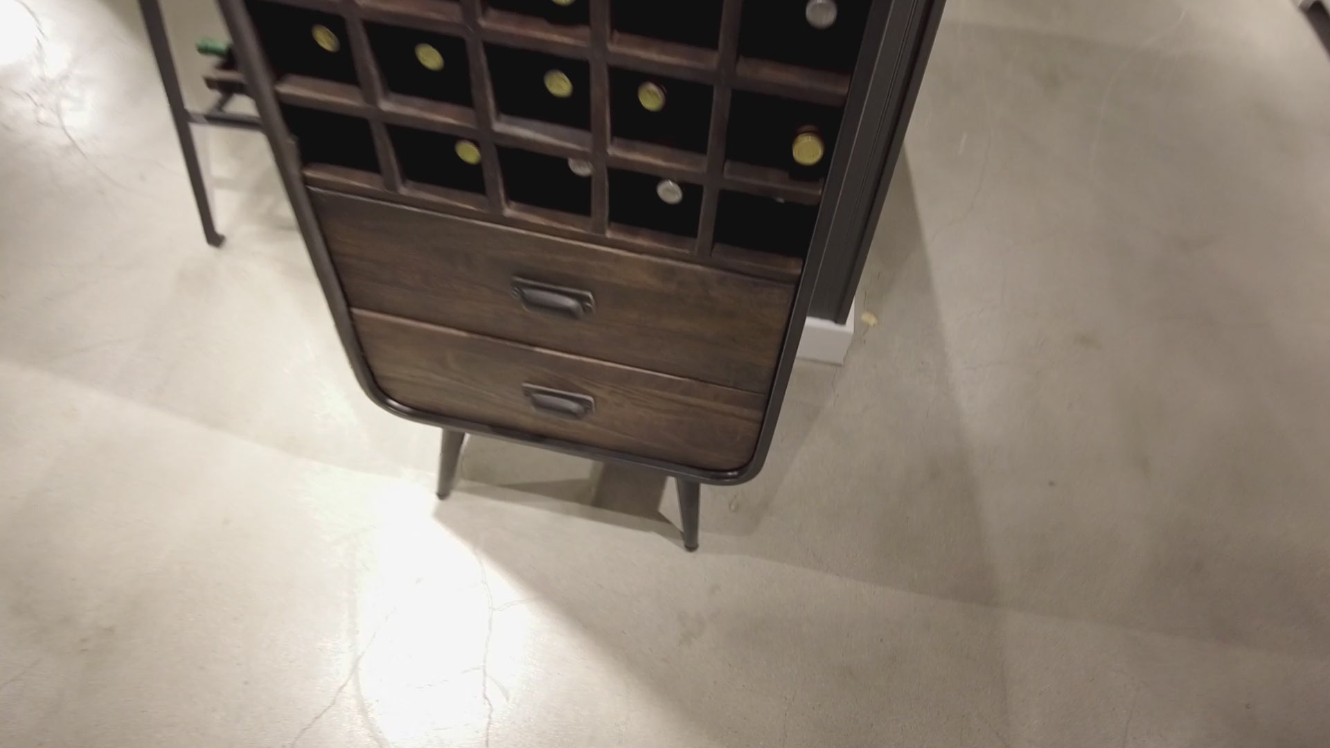 Ample Storage: Never worry about wine and barware storage again. A metal stemware rack holds up to 12 large wine glasses and a wooden wine bottle rack in the lower cabinet holds up to 20 bottles. Two wooden drawers with smooth running metal slides and metal cup pulls complete the storage, finished in aged iron.